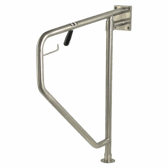 Barra de apoyo abatible trapezoidal de giro horizontal, con fijación a pared y suelo, y portarrollos