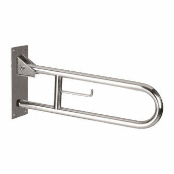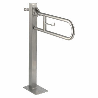 Barra de apoyo abatible de giro vertical con pata de apoyo a suelo desplegable y portarrollos de acero inoxidable AISI 304