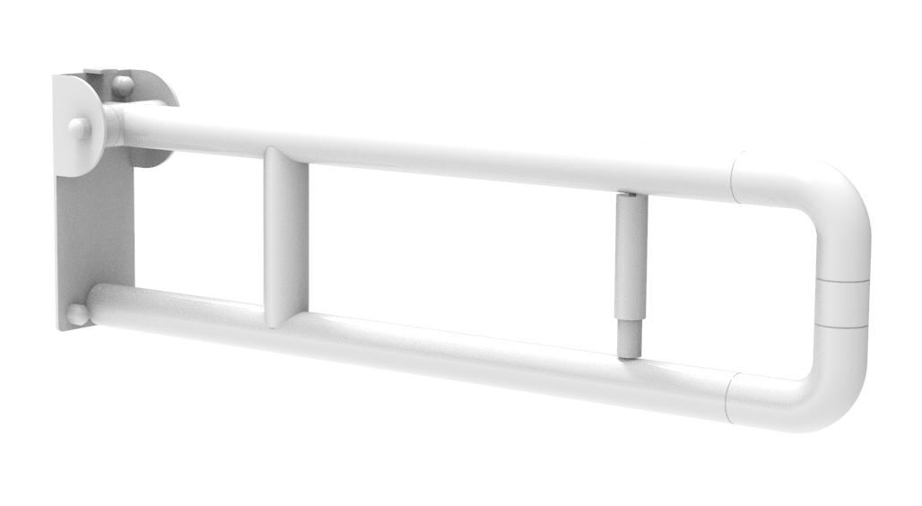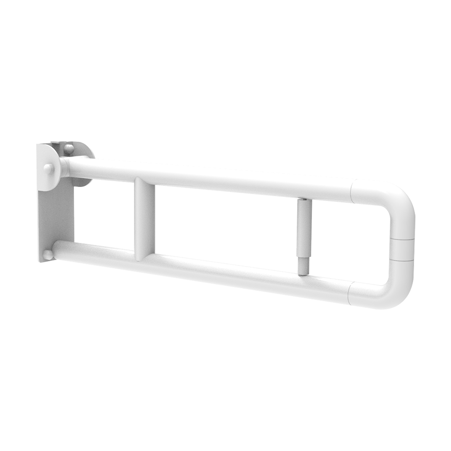 Barra de seguridad abatible de 700 mm con portarrollos, bloqueo y sistema de prevención de accidentes.