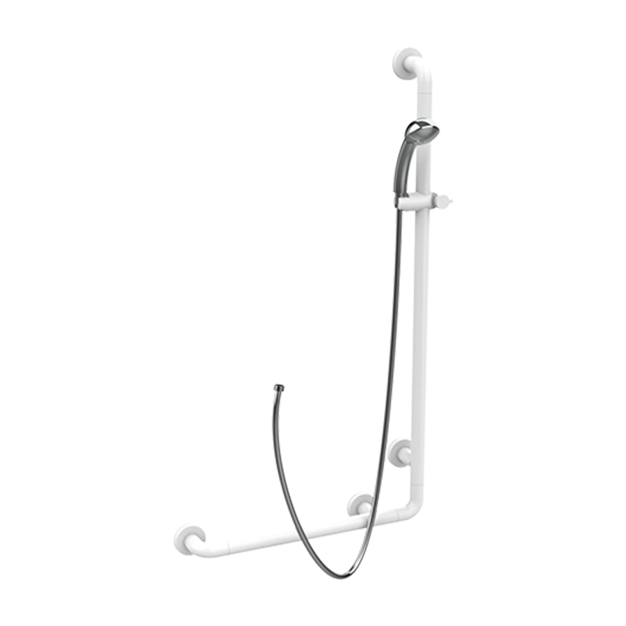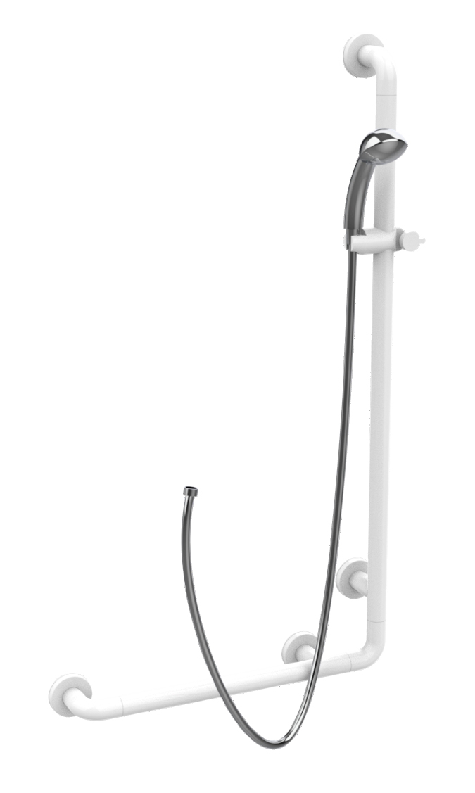 Barra de apoyo angularl Ø35 mm y 600×1100 mm con función de barra corredera, ducha jet en abs cromado, tubo flexible.