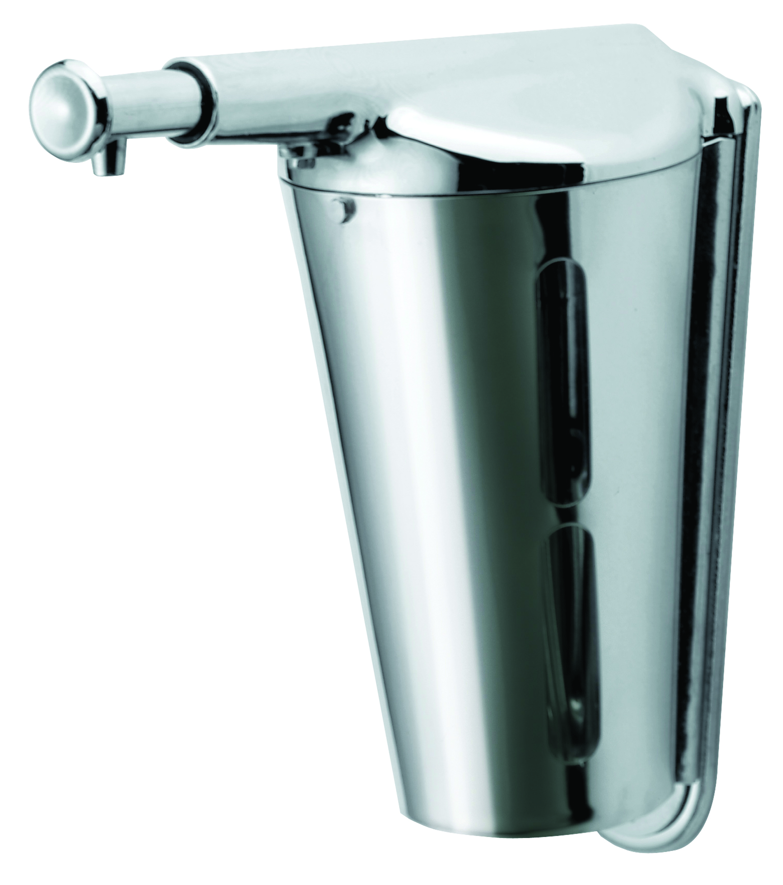 Dispensador de jabón líquido cónico, de accionamiento manual por pulsador, para instalación en pared.