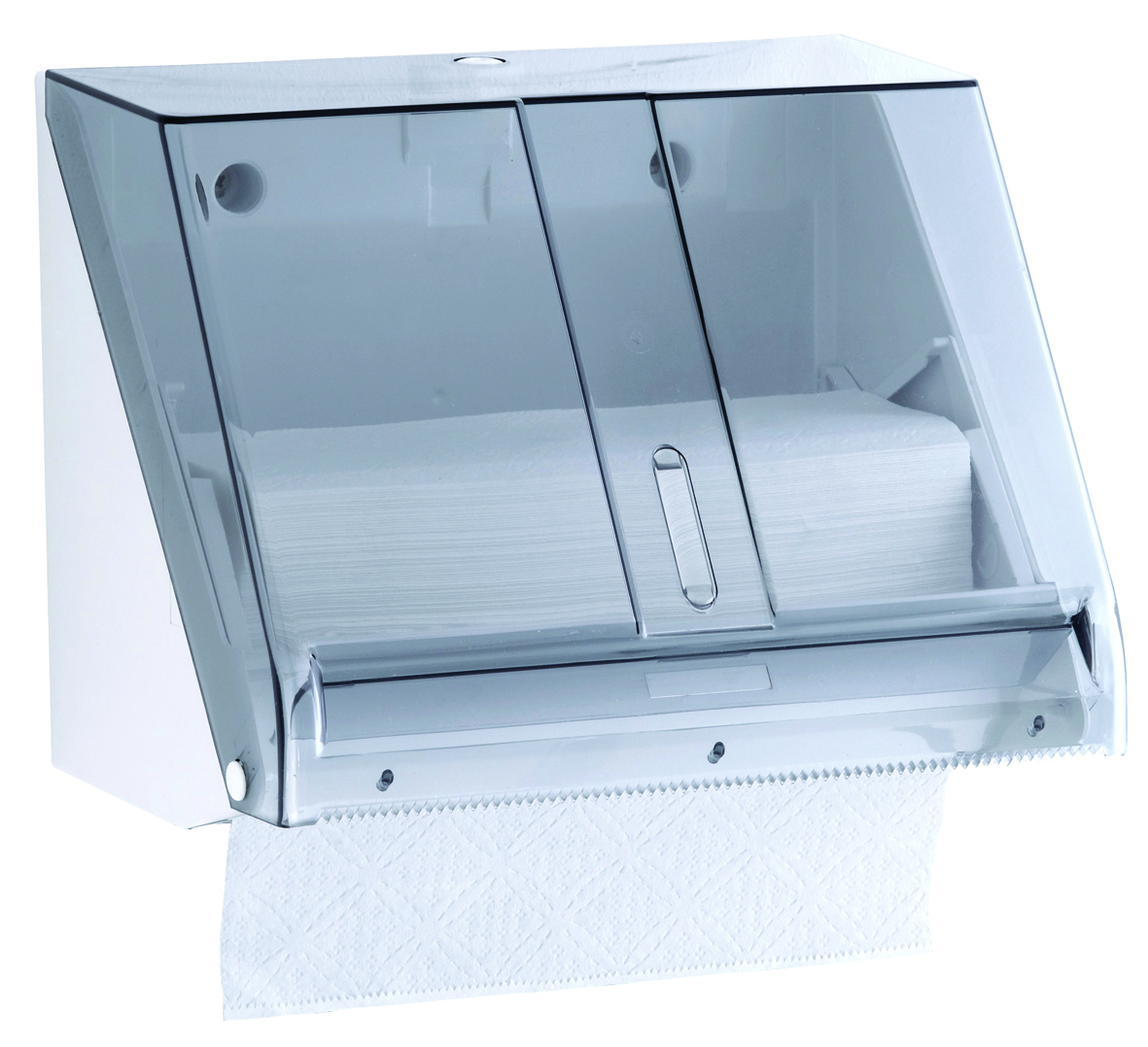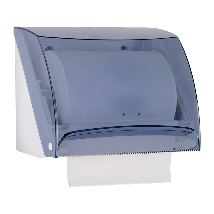 Dispensador de papel toalla combi, de ABS blanco y fumé azul, para adosar a la pared.