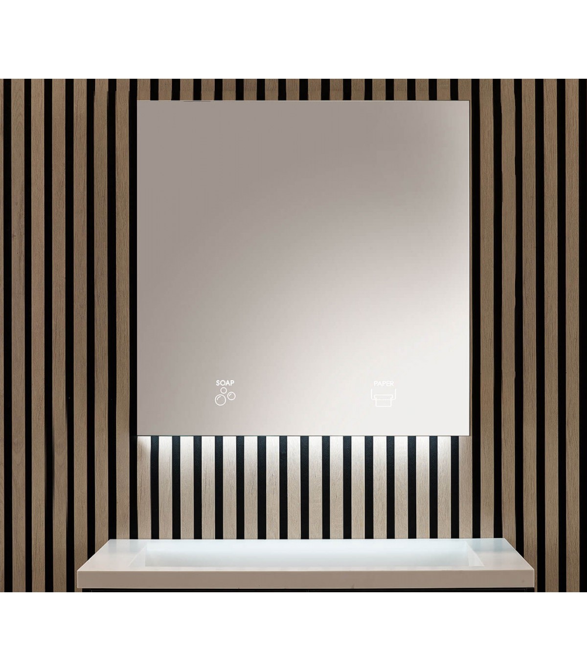 •Complete hygiene cabinet with mirror and lock. It includes a sensor-operated soap dispenser and a paper towel dispenser. With LED pictograms.