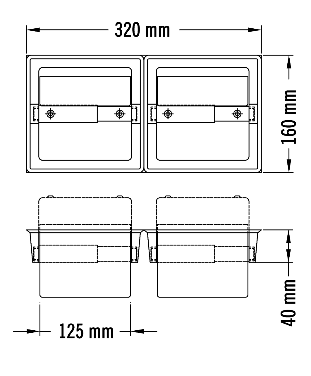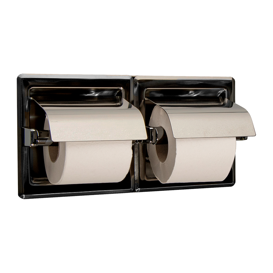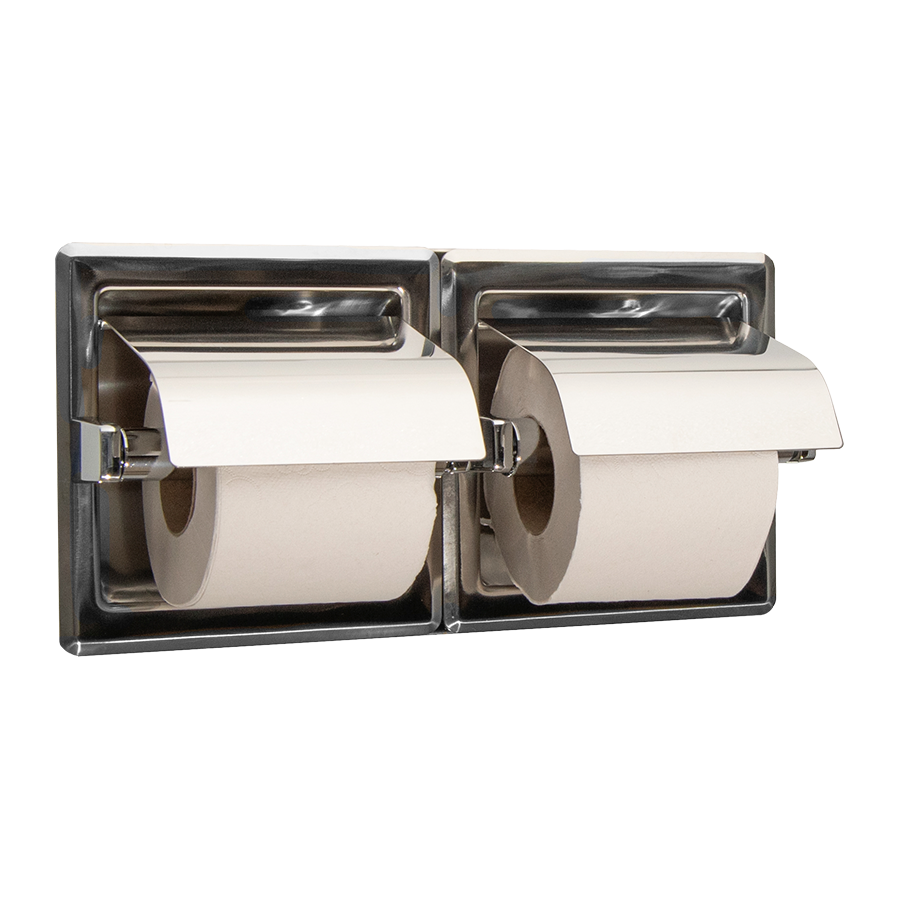 Double recessed toilet roll holder with cover and AISI 304 stainless steel casing.