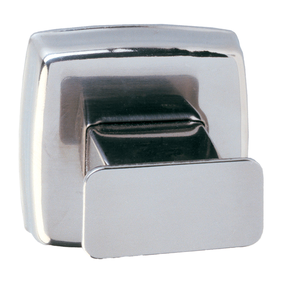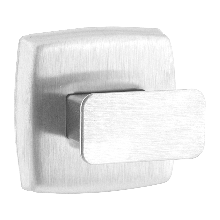Single bathroom robe hook made of AISI 304 stainless steel, for wall mounting.