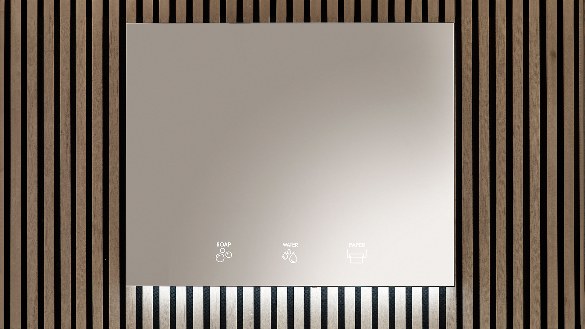 The mirror features pictograms of soap, water and paper for intuitive identification.