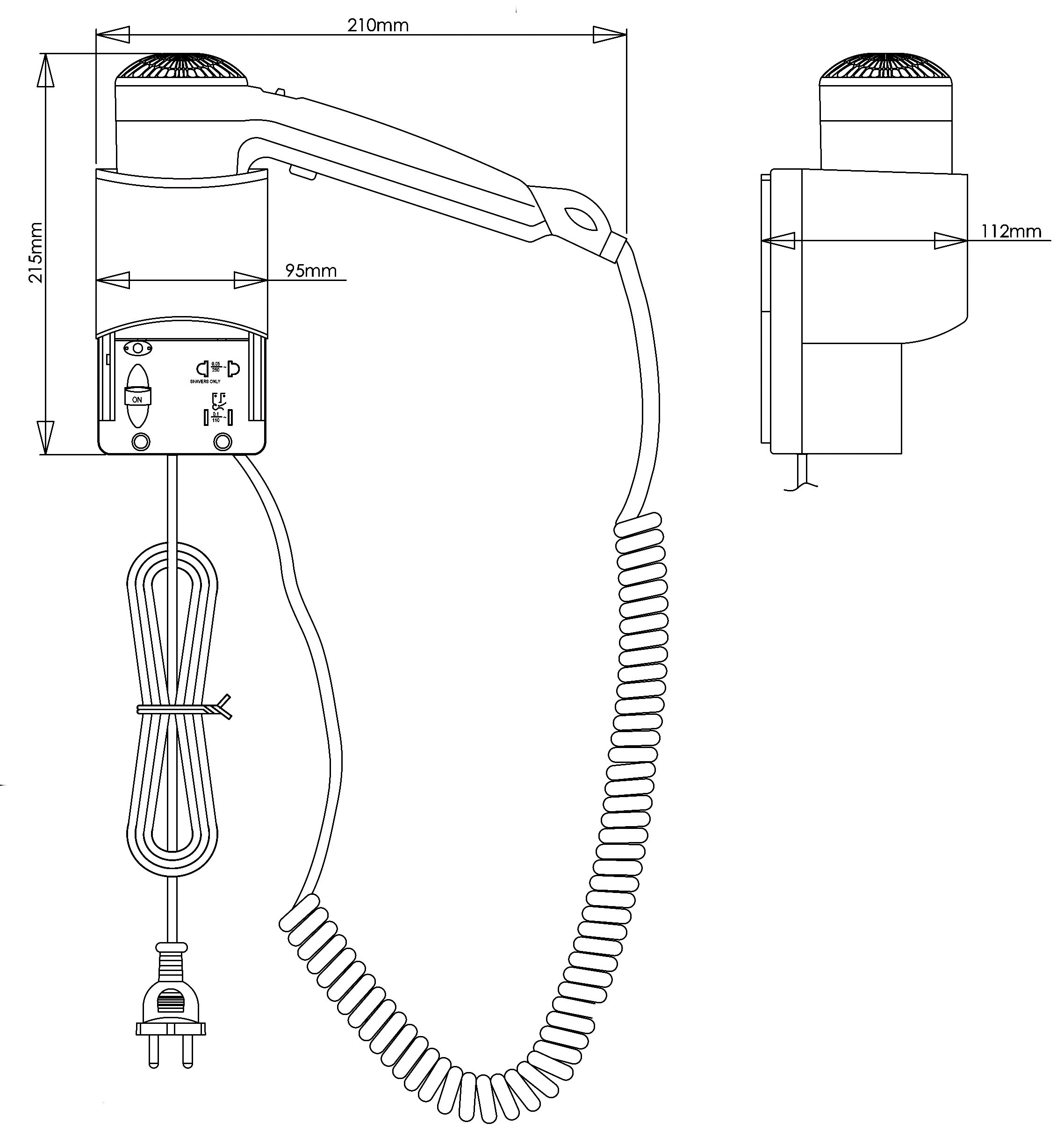 Hotel wall-mounted hair dryer, functional, robust and with a modern design that allows it to be easily integrated into any space