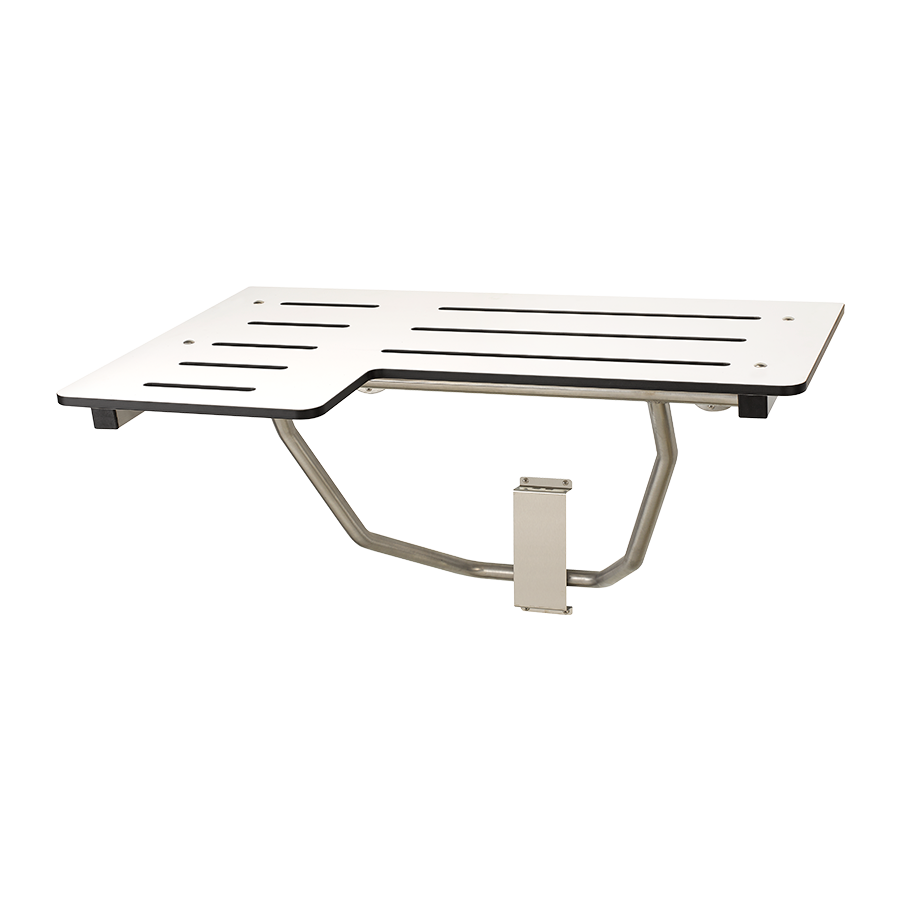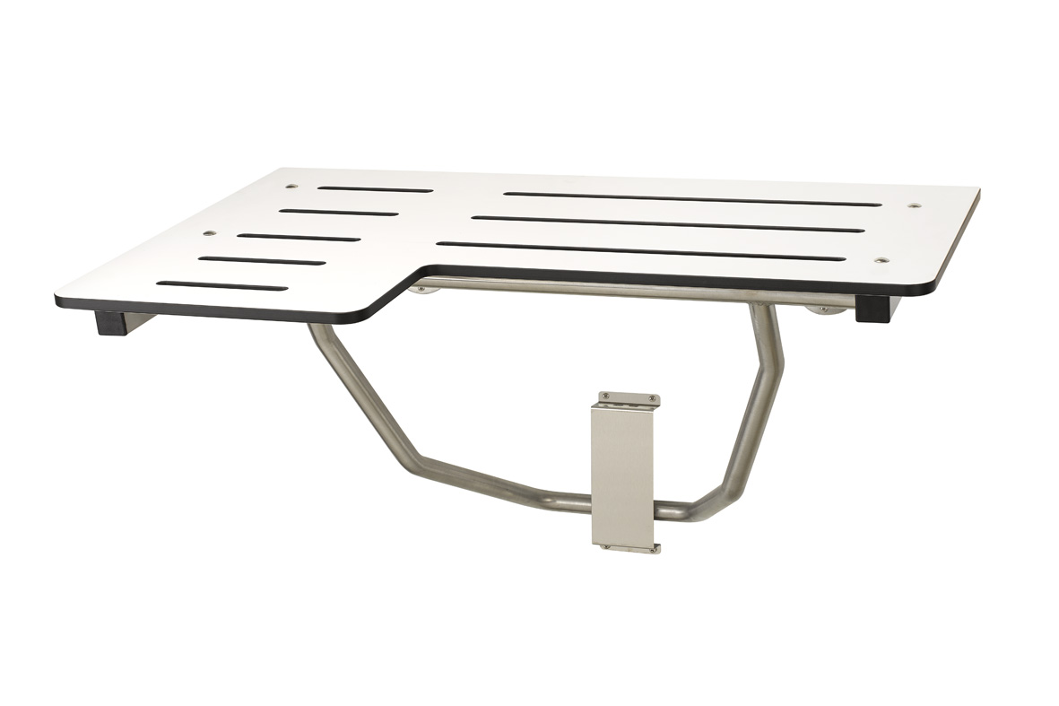 Foldable and reversible L-shaped shower seat with wall support leg, satin finish.