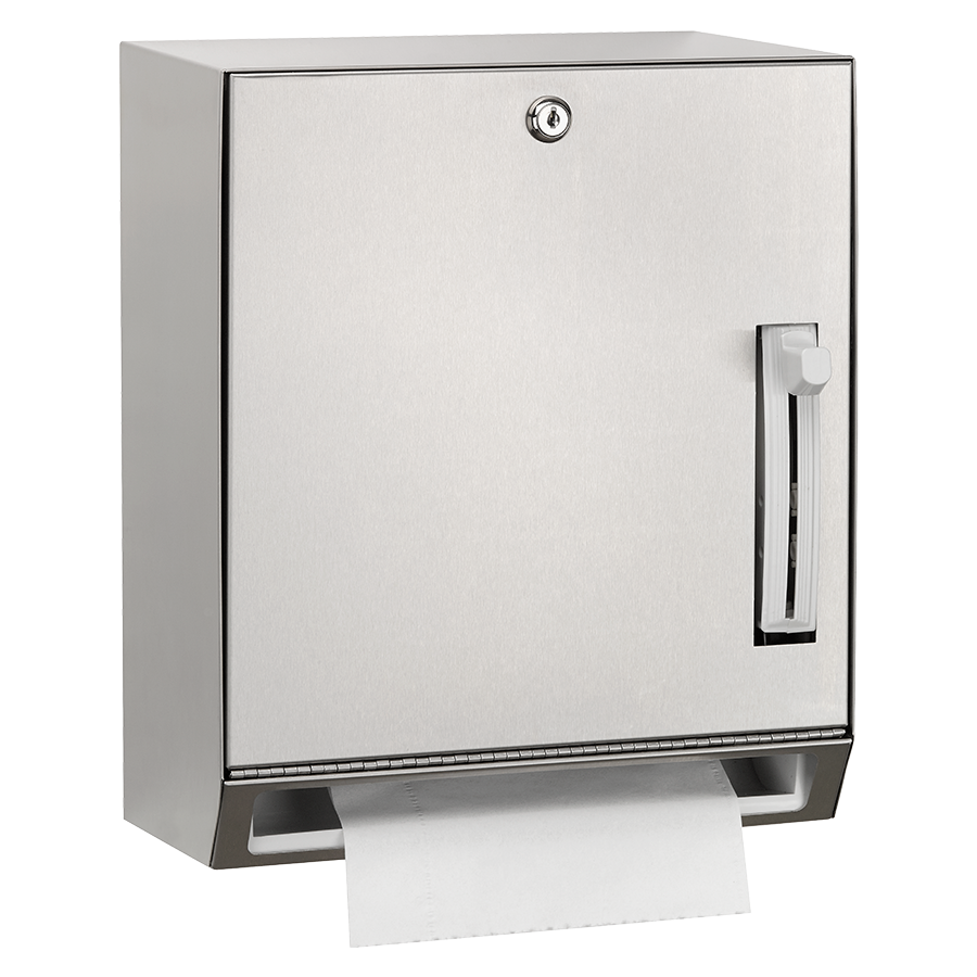 Manual lever-operated paper towel dispenser, for wall mounting.
