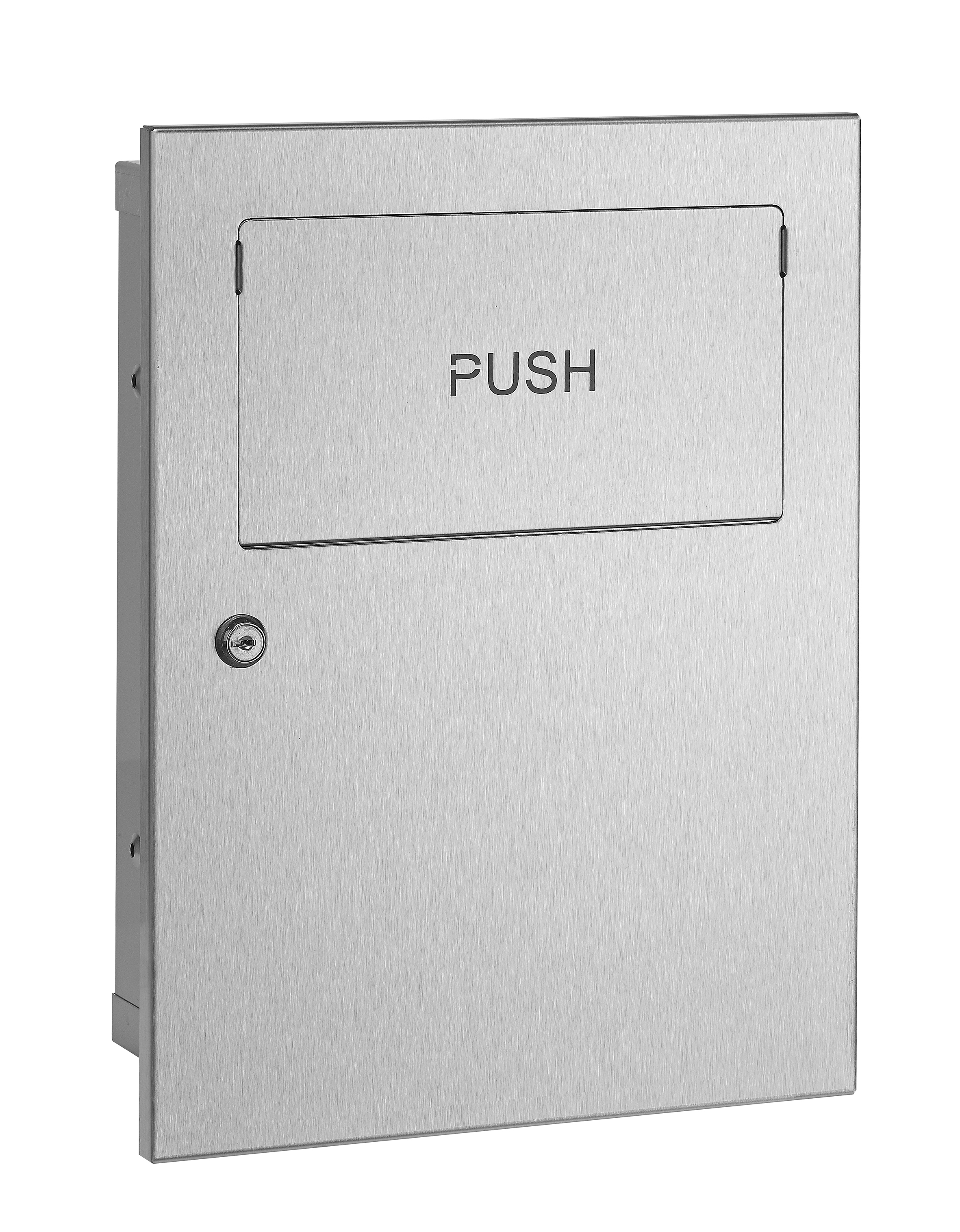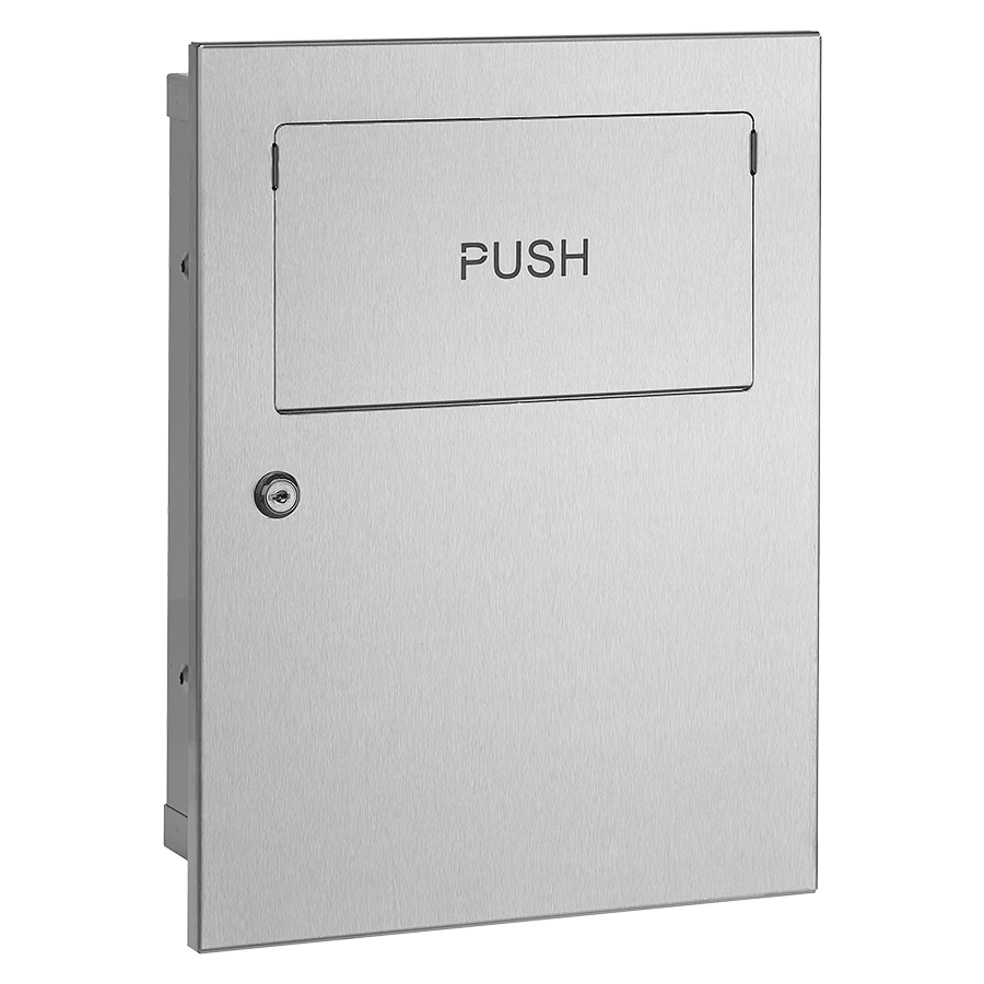 Wall-mounted bin with self-return lid for direct wall recessing, 5.4L capacity.