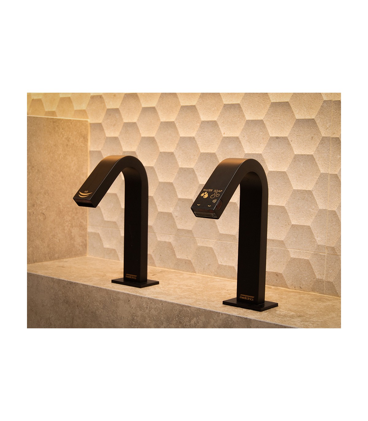 • Mediclinics® All-in-one is a countertop mounted hand dryer tap and a water and soap dispenser faucet, all ready to work together as one beautiful, touch-free, hygienic and highly efficient system.