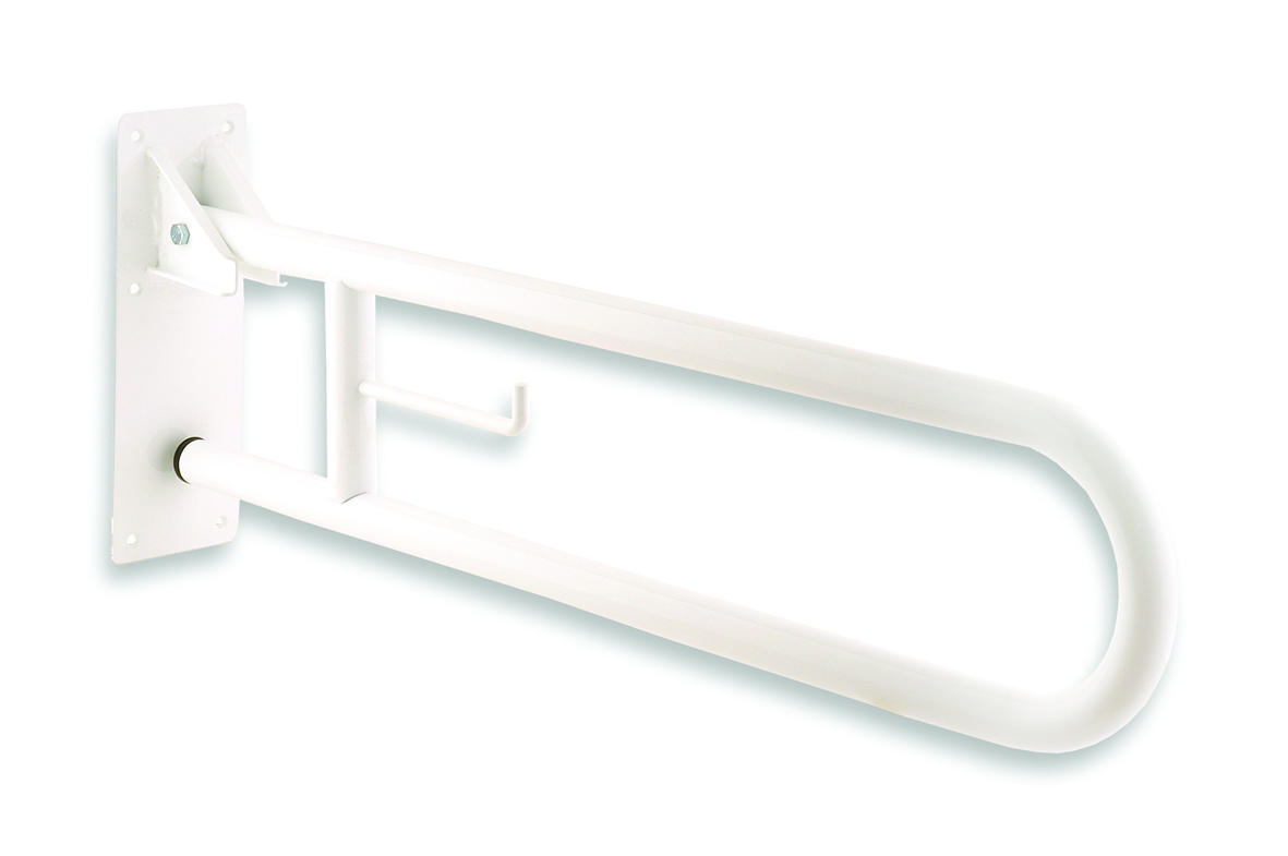 Barra abatible de giro vertical con portarrollos, fabricada con tubo de diámetro 32 mm, para colocar junto al inodoro.