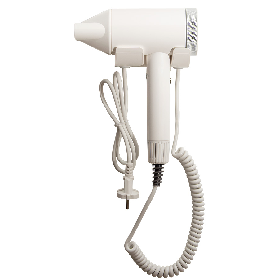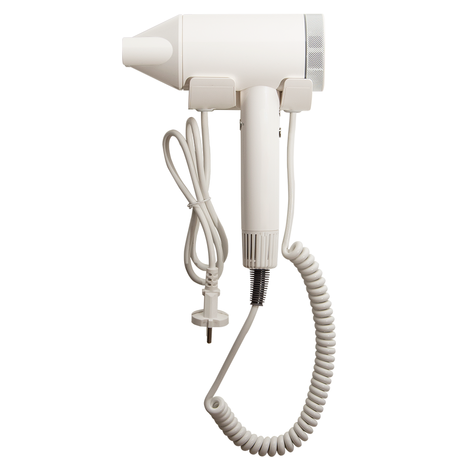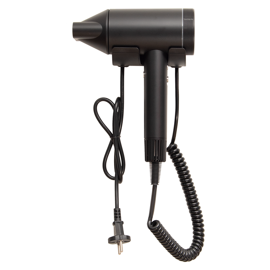 Secador de cabello para montaje en pared, diseñado para baños de hotel con un estilo moderno, funcional y robusto.