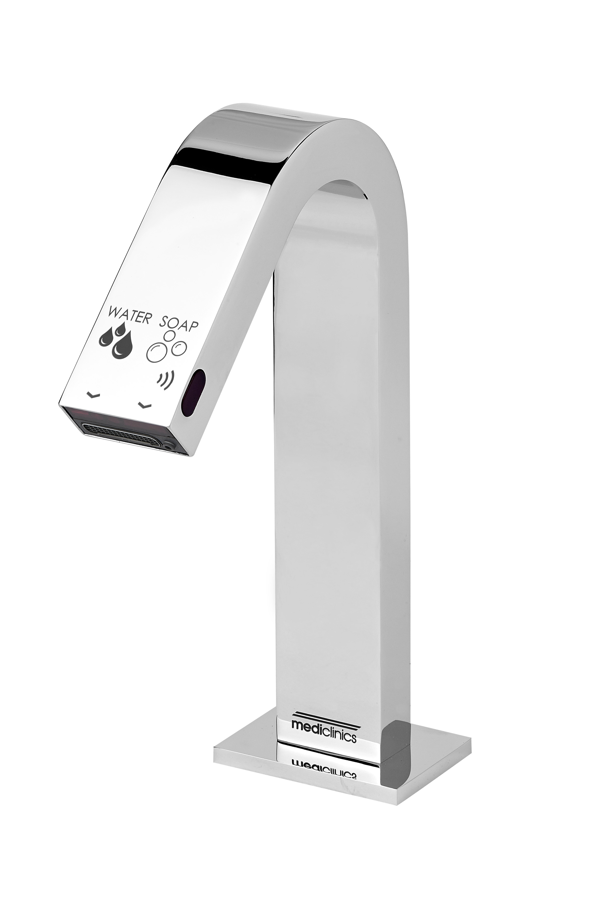Grifo automático All-in-One de Mediclinics® que integra dispensación de agua y jabón sin contacto mediante sensores independientes.