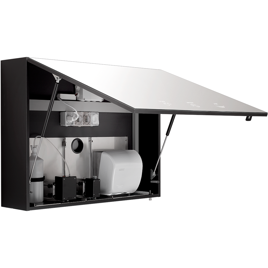 Sistema integrato di lavaggio e asciugatura mani posizionato dietro lo specchio.