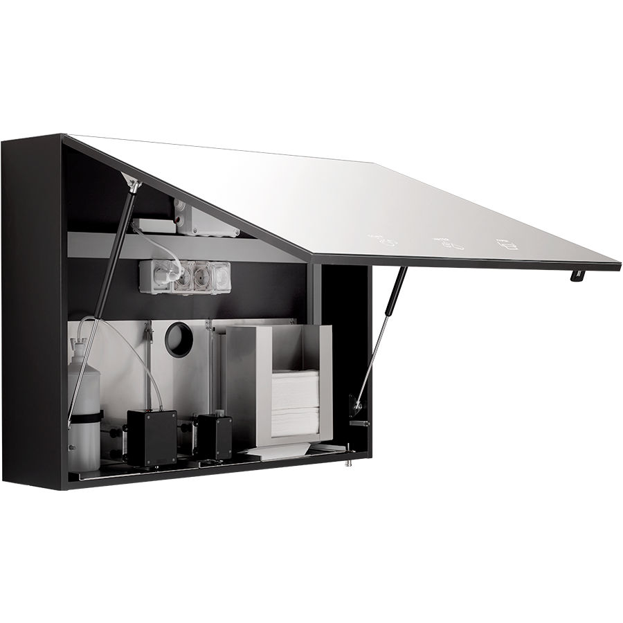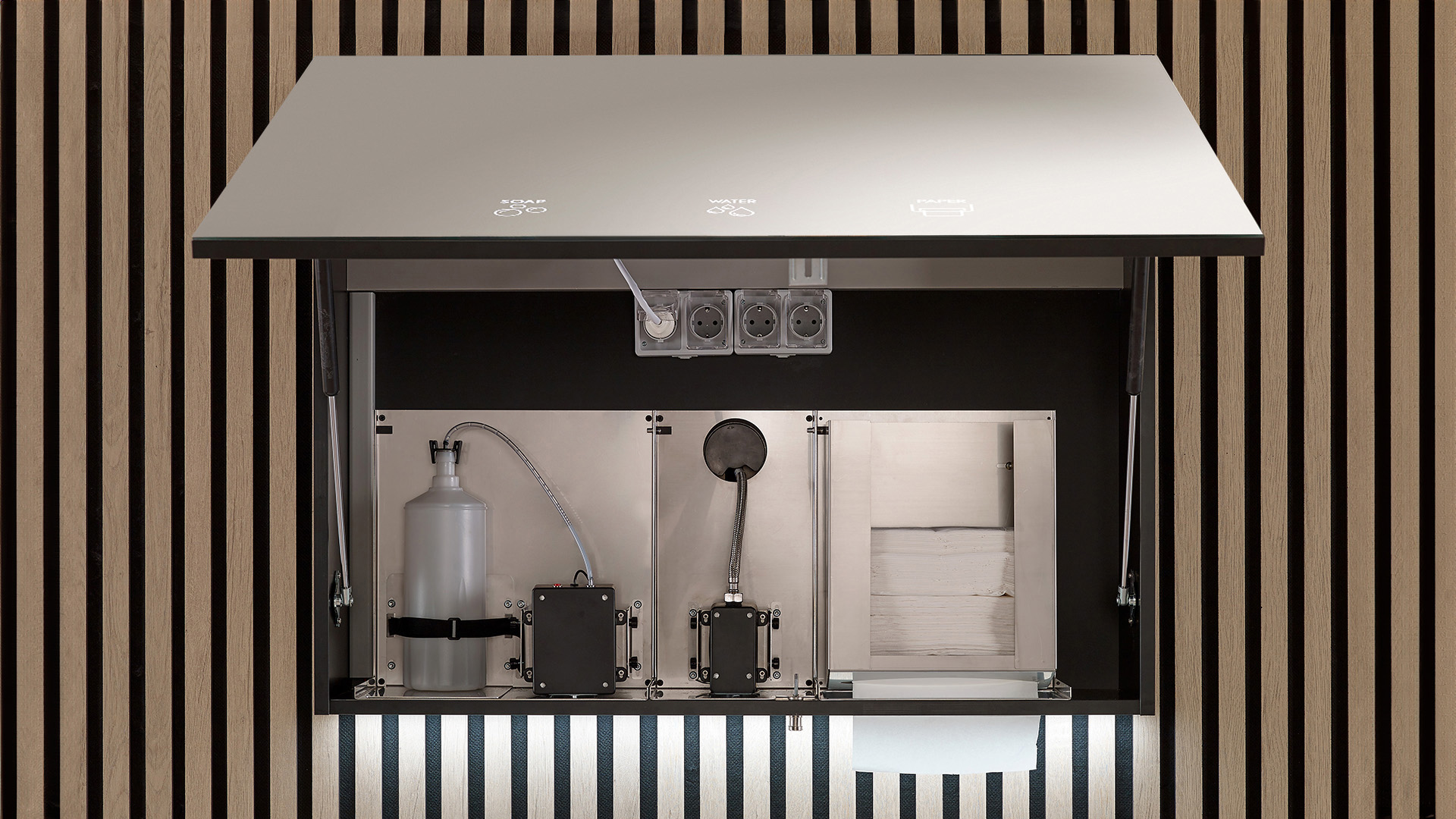 Sistema integrato di lavaggio e asciugatura mani posizionato dietro lo specchio.