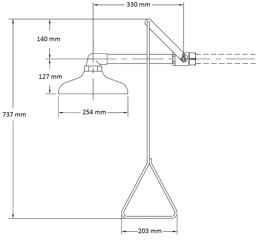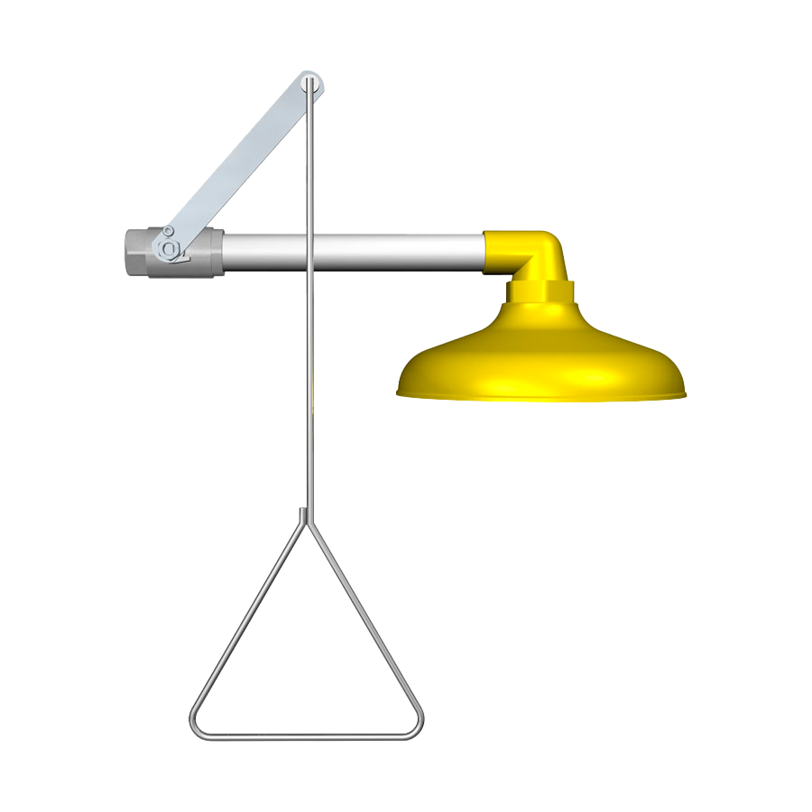 • La ducha de seguridad descontamina al accionar manualmente el tirador triangular, liberando agua inmediatamente.
