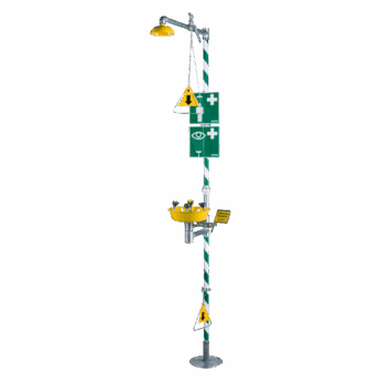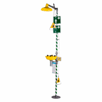 Equipos integrales que combinan ducha de seguridad y lavaojos, garantizando una respuesta rápida y efectiva ante accidentes químicos.