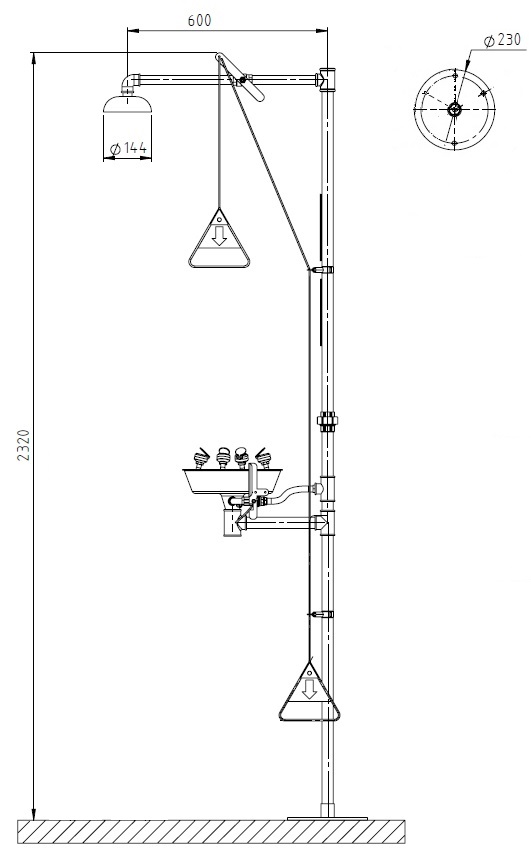 • Ducha con tirador triangular para mejor agarre y lavaojos con apertura lateral por presión. Incluye segundo tirador accesible para usuarios en silla de ruedas.