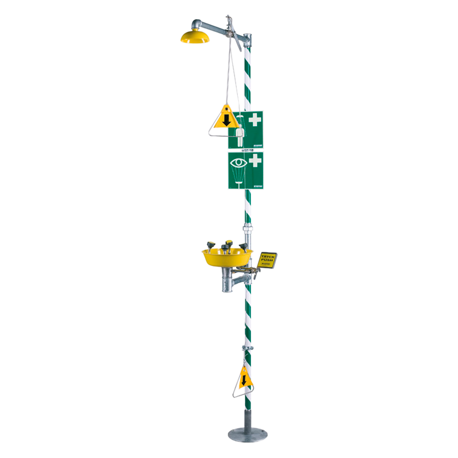 • Ducha y lavaojos de acero inoxidable amarillo, tuberías galvanizadas blancas con franjas verdes.