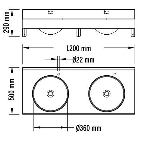 Lavamanos encimera doble para instalar directamente en la pared acabado satinado.