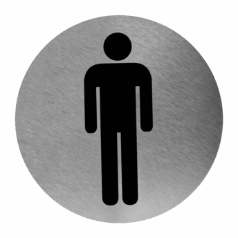 Señal autoadhesiva para baño de hombre, en acero inoxidable AISI 304 satinado, con gráfica negra impresa.
