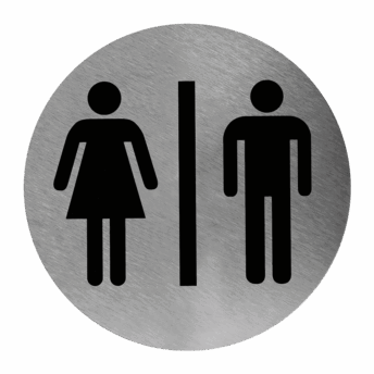 Señal autoadhesiva para baño unisex, en acero inoxidable satinado AISI 304, con gráfico negro impreso.