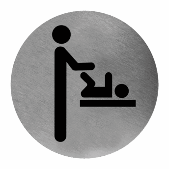 Señal autoadhesiva para zona de cambio de pañales, en acero inoxidable AISI 304 satinado, con gráfica negra impresa.