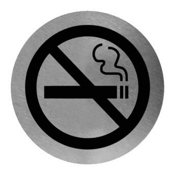 Señal autoadhesiva de “Prohibido fumar”, en acero inoxidable AISI 304 satinado, con gráfica negra impresa.