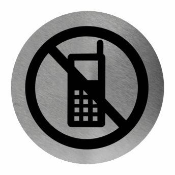 Señal autoadhesiva de “Prohibido utilizar el móvil”, en acero inoxidable AISI 304 satinado, con gráfica negra impresa.