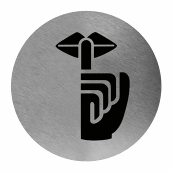 Señal autoadhesiva de silencio, en acero inoxidable AISI 304 satinado, con gráfica negra impresa.