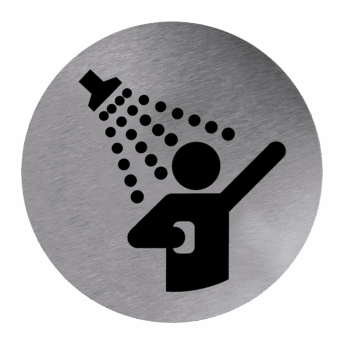 Señal autoadhesiva para zona de duchas, en acero inoxidable AISI 304 satinado, con gráfica negra impresa.