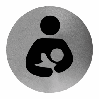 Señal autoadhesiva para zona de lactancia, en acero inoxidable AISI 304 satinado, con gráfica negra impresa.