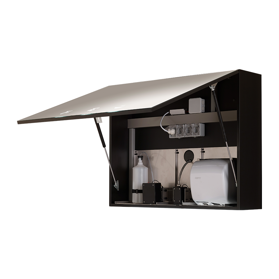 Sistema de lavado y secado de manos integrado detrás del espejo.